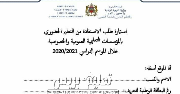 تحميل مطبوع استمارة طلب الاستفادة من التعليم الحضوري ابتدائي إعدادي ثانوي 2021 2020 Pdf Jadid365 Ma