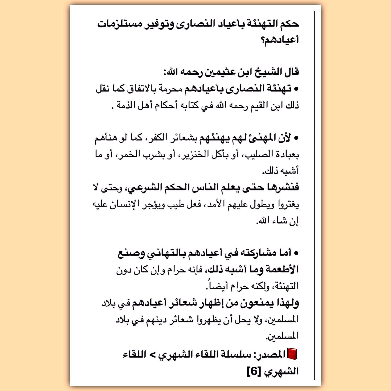 كبار علماء أهل السنة Twitterren حكم التهنئة بأعياد النصارى وتوفير مستلزمات أعيادهم قال الشيخ ابن عثيمين رحمه الله تهنئة النصارى بأعيادهم محرمة بالاتفاق كما نقل ذلك ابن القيم رحمه الله في