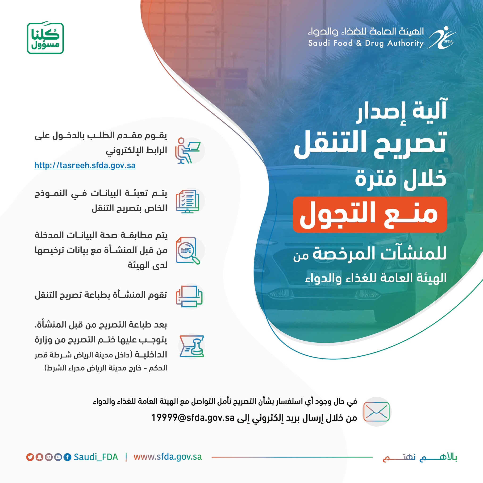 الموقع الإلكتروني للهيئة العامة للغذاء والدواء. لقاء مفتوح لمناقشة الأنظمة الالكترونية للرقابة على الغذاء المستورد. تهدف الهيئة العامة للغذاء والدواء إلى راحة مراجعيها وذلك لعلمها أن سبيل النجاح هو الشفافية السرعة وسهولة التعامل ومن هذا المنطلق تم إطلاق صفحة الاستعلام عن المعاملات التي نأمل أن تحوز على رضاكم.
